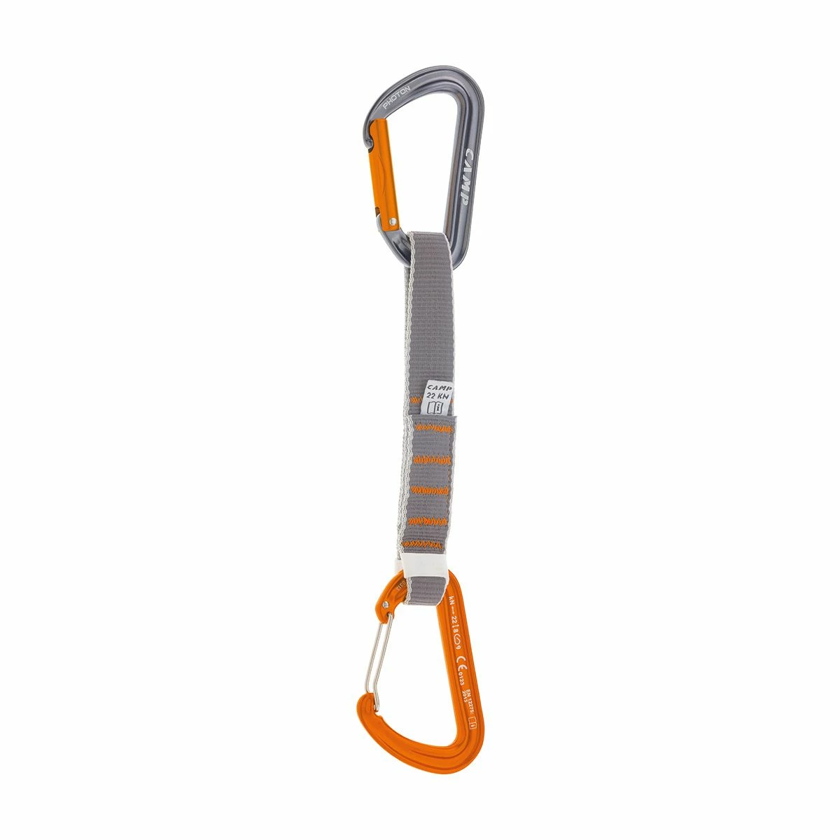 The Photon Mixed Express KS Quickdraw features a prime combination of two carabiners that have been perfectly optimized for their function. The Photon is CAMP’s lightest solid gate carabiner featuring proprietary SphereLock closure for easy clipping and cleaning. The Photon Wire delivers pure clipping bliss on the sharp end with its finely contoured, perfectly tensioned gate and large gate opening. The Photon Mixed Express KS also uses CAMP’s most sophisticated dogbone with variable width webbing that makes them easy to grab while projecting sport routes and the proprietary Karstop Evo carabiner retainer on the rope end. Available in 11 and 18 cm lengths.