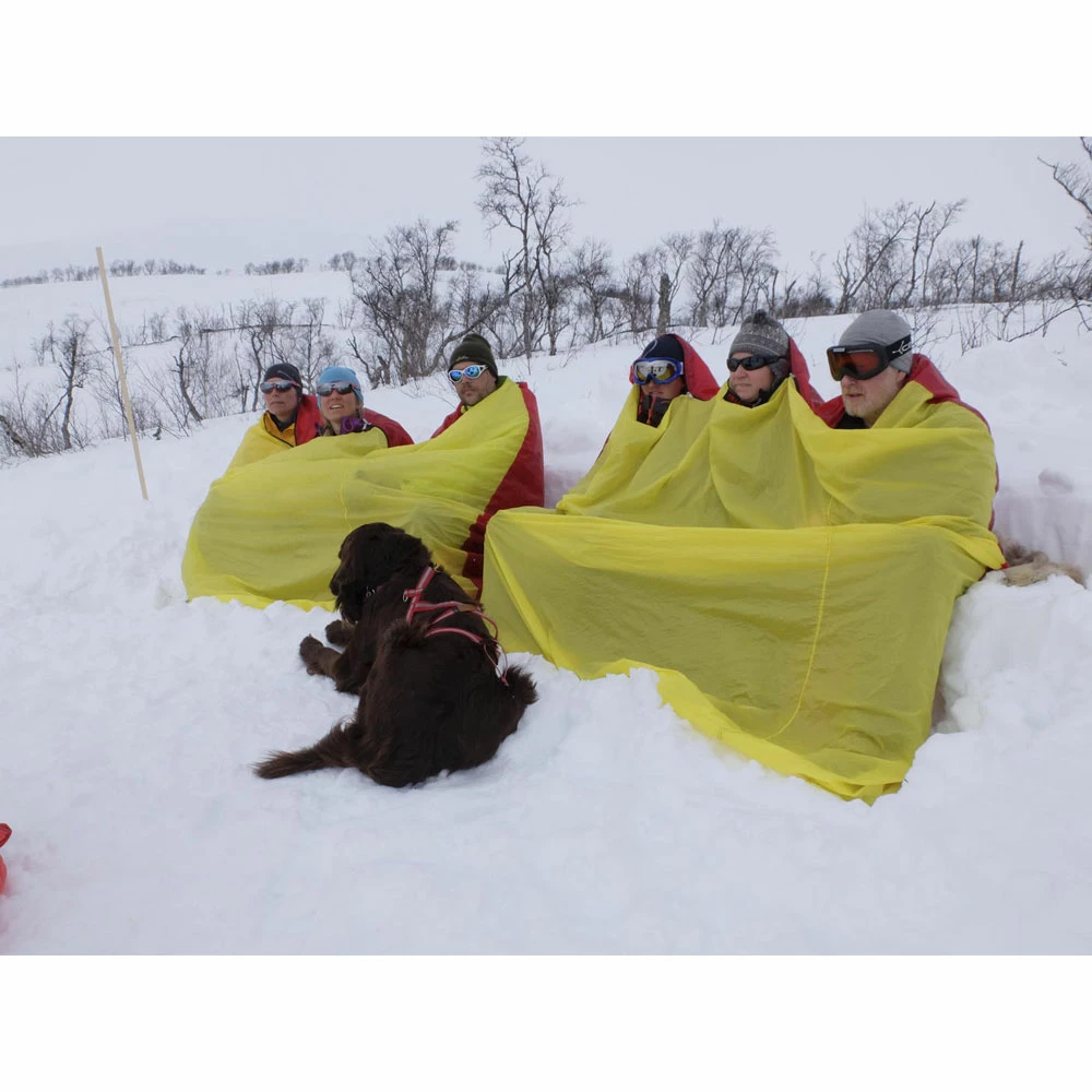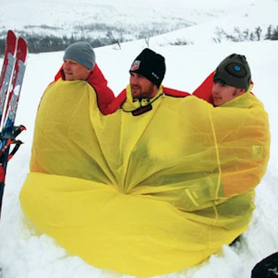 This traditional piece of equipment is given a place in most everyone’s backpack in Scandinavia when walking, skiing or climbing in the mountains. It provides superb protection against wind, snow, and other poor conditions. The Windsack 3 is windproof and water repellent. It has an extended range of applications: protection from the elements on a break, emergency bivouac in a sudden snow storm, a sleeping bag cover in a snow cave, or as a shelter from the wind when you are working on your tan! It is excellent protection against hypothermia when you have to sit out a storm in the mountains. And it is so light that you do not have to do without it on any kind of trip. Three people with smaller backpacks or two people with larger ones have room in the Windsack 3. The Windsack is both roomy and light. At the top there is a zipper with four runners allowing you to stick out your head or to vent out air, and the bottom has a draw cord to cinch around the feet. The top corners have pockets for ski tips.