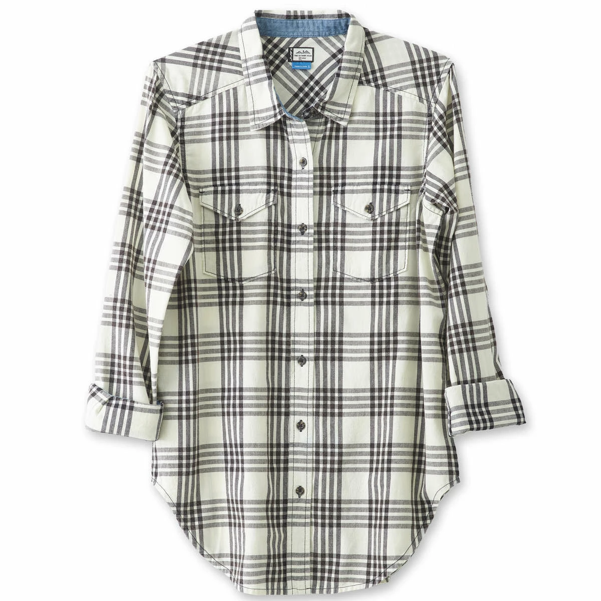 Boyfriend fit, long sleeve button up shirt, stand collar, two chest flap pockets, corduroy elbow patches, deep curved hem.