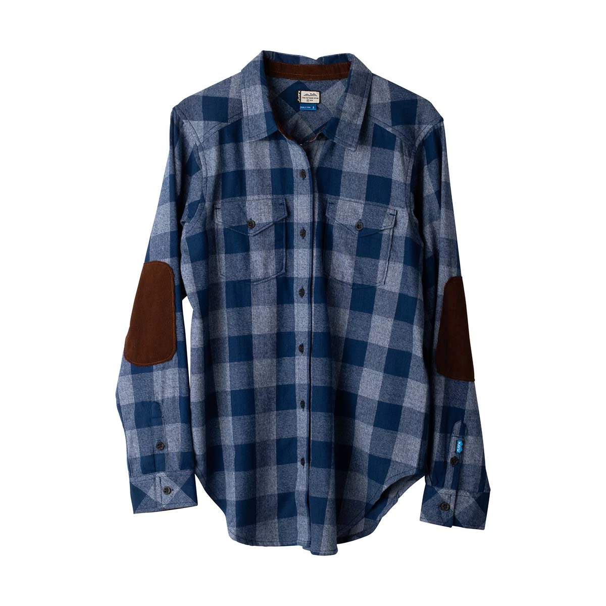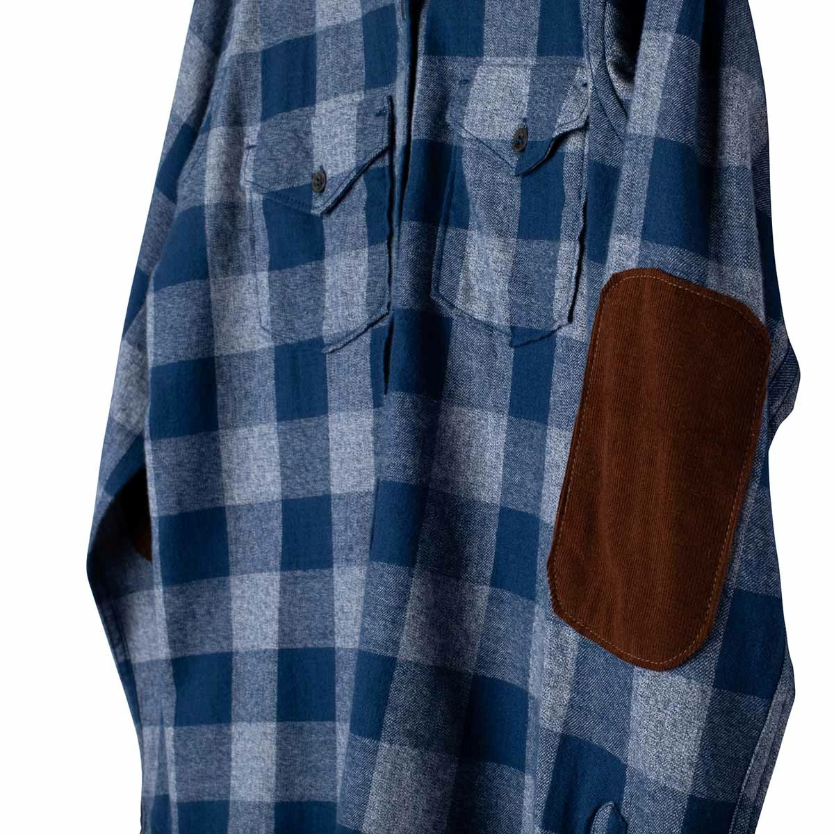 Boyfriend fit, long sleeve button up shirt, stand collar, two chest flap pockets, corduroy elbow patches, deep curved hem.