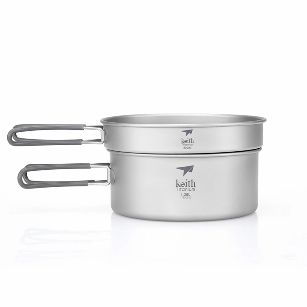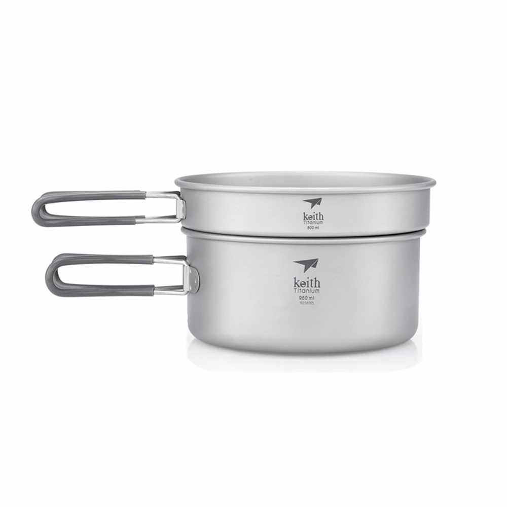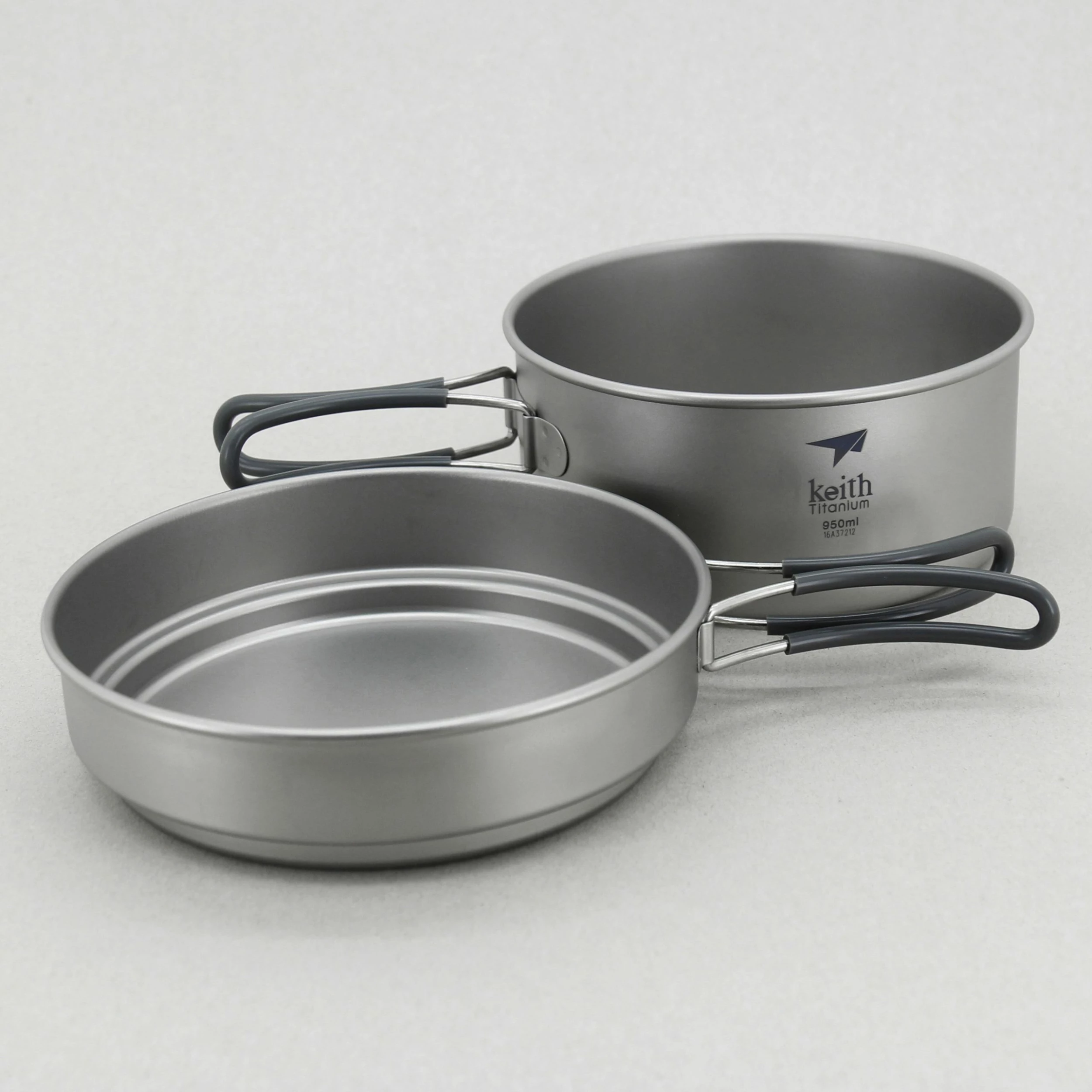 The 2-Piece Titanium Pot and Pan Cook Set from Keith is an ultralight camping cook set made from titanium.