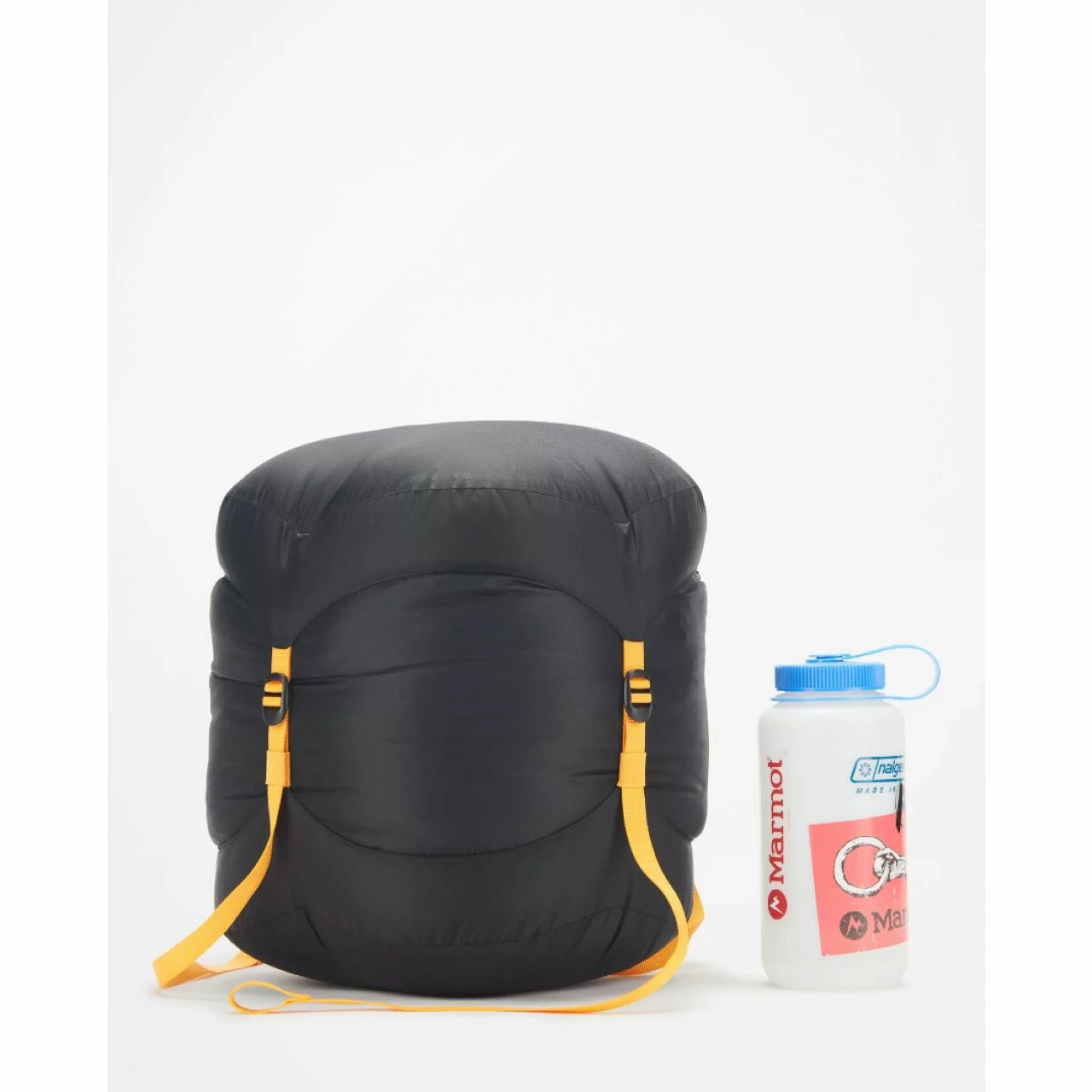 Handle unforgiving alpine environments in the Marmot Col sleeping bag. Stuffed with 800-fill-power down and made with waterproof and windproof Pertex® Shield Fabric, this lightweight sleeping bag keeps you warm and dry when Mother Nature is fickle. A draft tube and collar and a center zip lets you regulate heat. Dual side zippers provide ventilation and allow arm use.