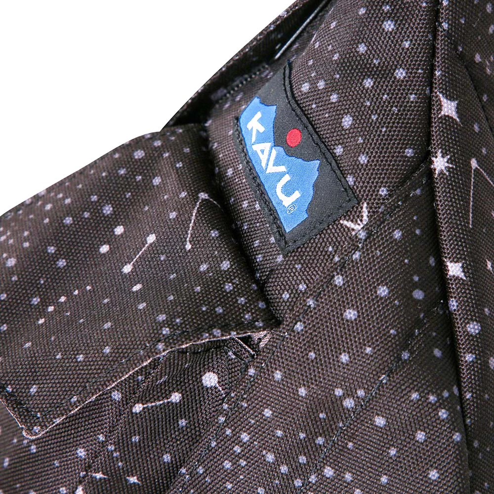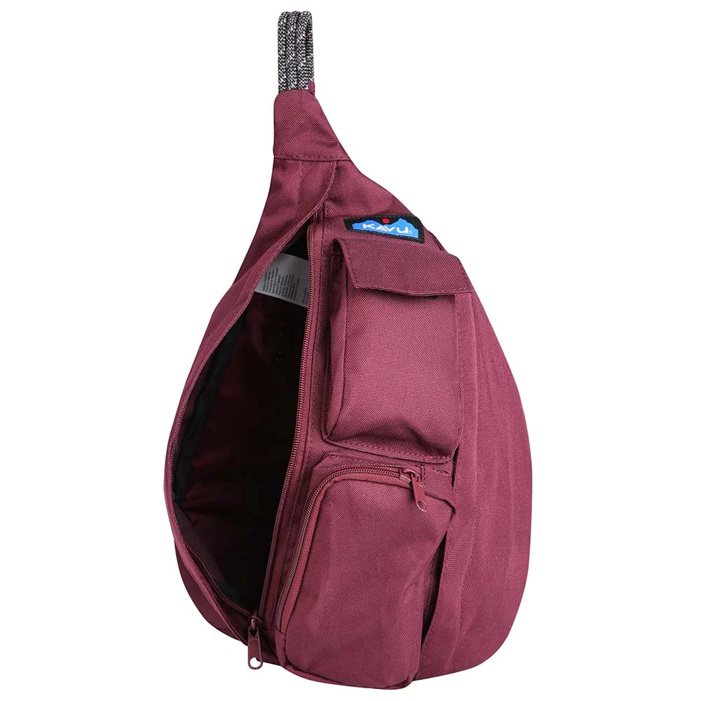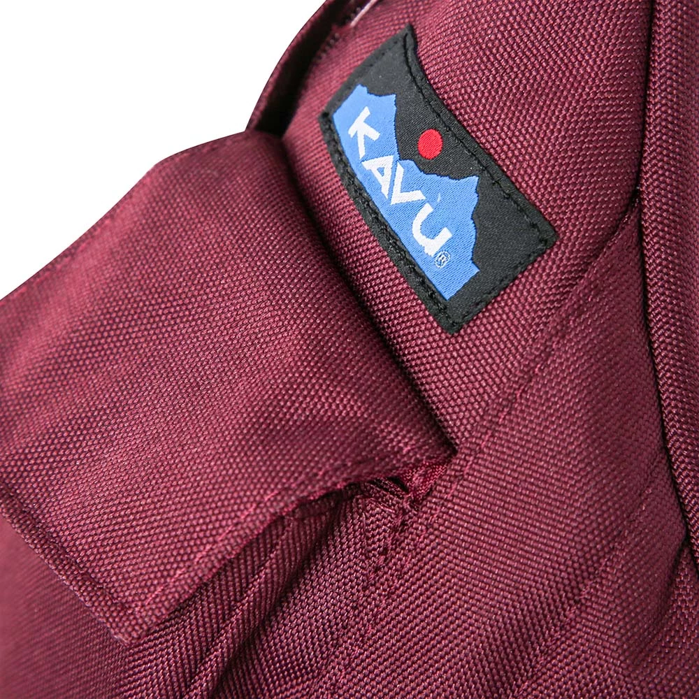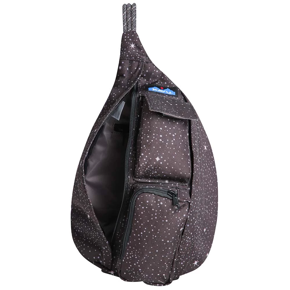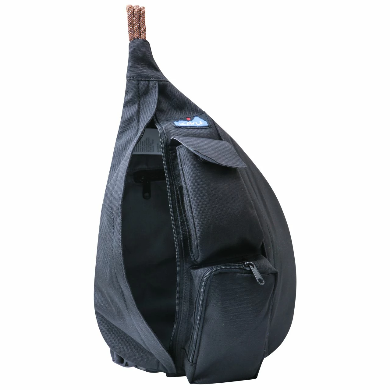 Mini sling pack with adjustable rope shoulder strap, two vertical zip compartments, two key or cell phone pockets, padded back with KAVU embroidery.