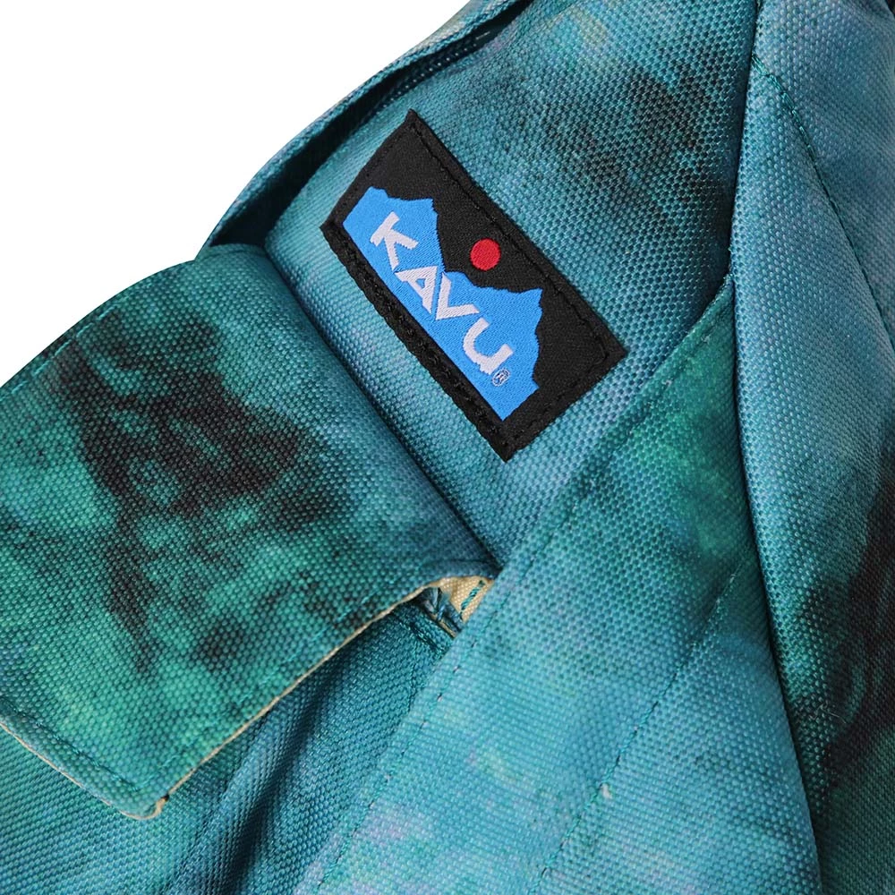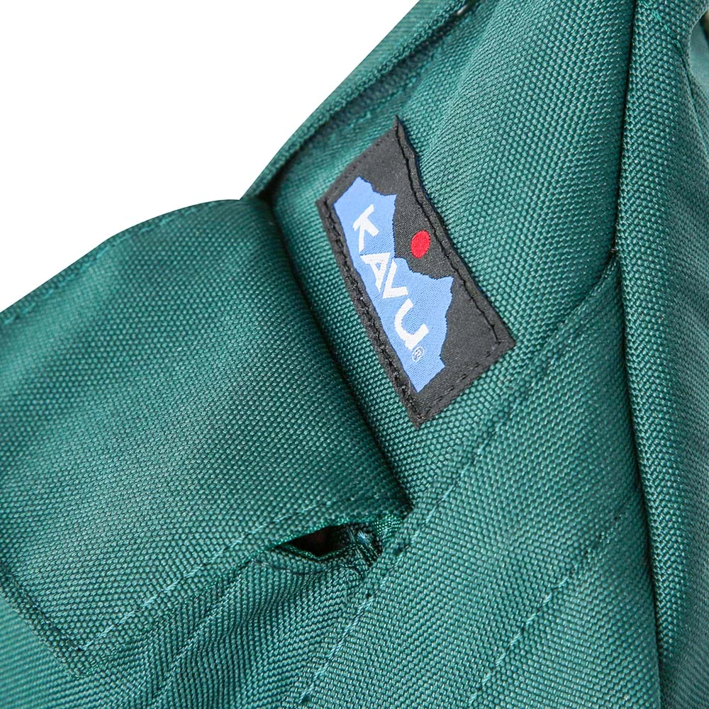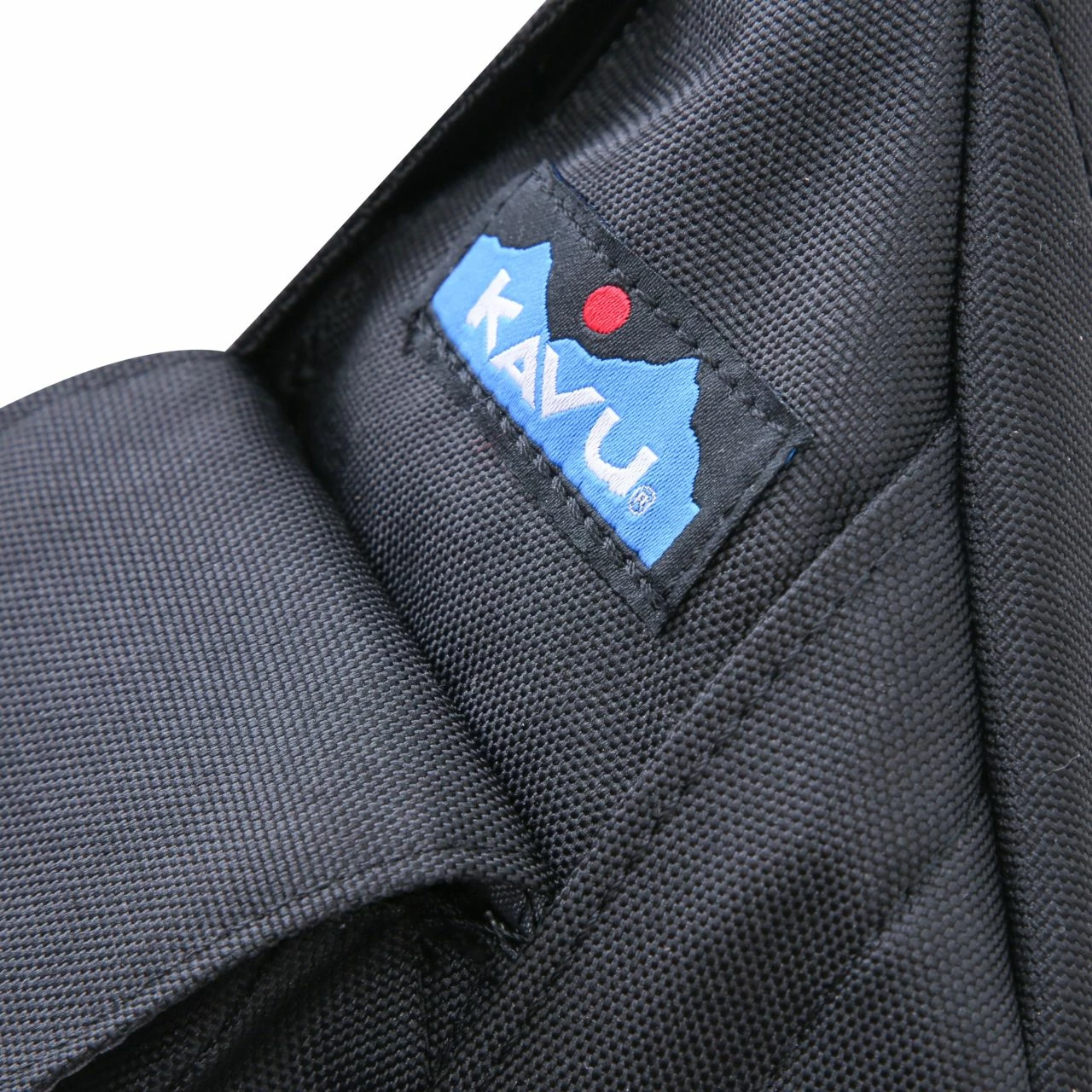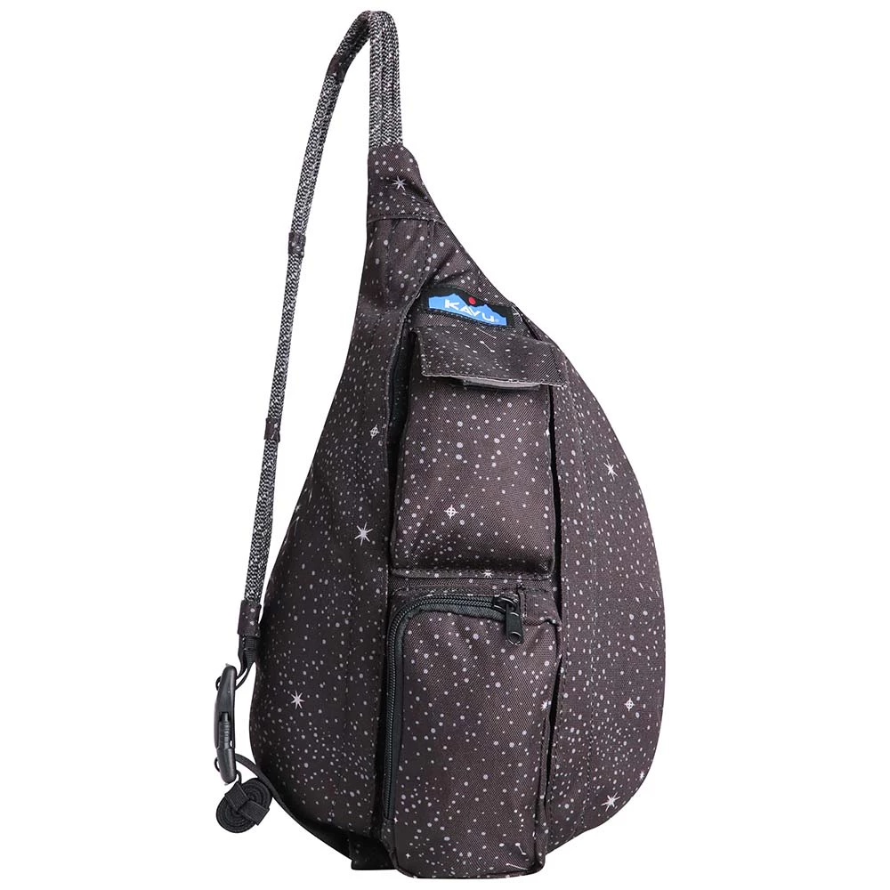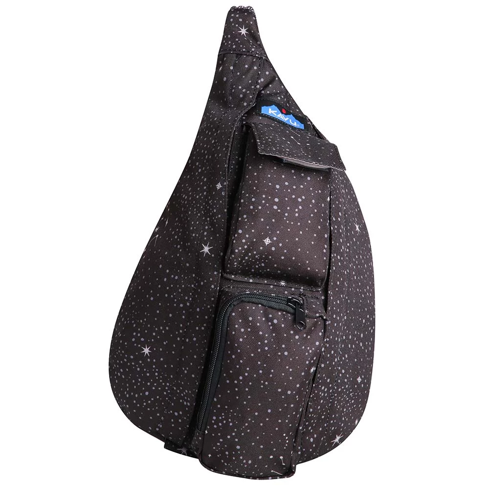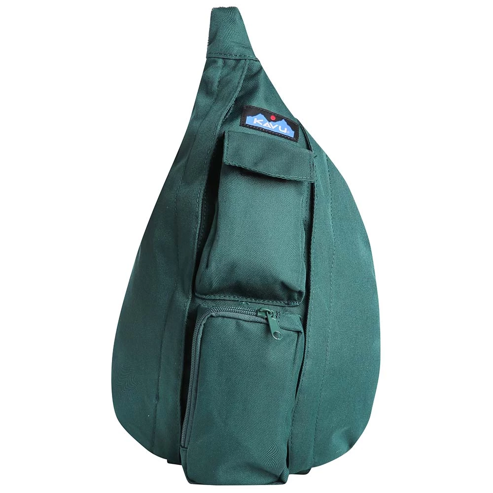 Mini sling pack with adjustable rope shoulder strap, two vertical zip compartments, two key or cell phone pockets, padded back with KAVU embroidery.