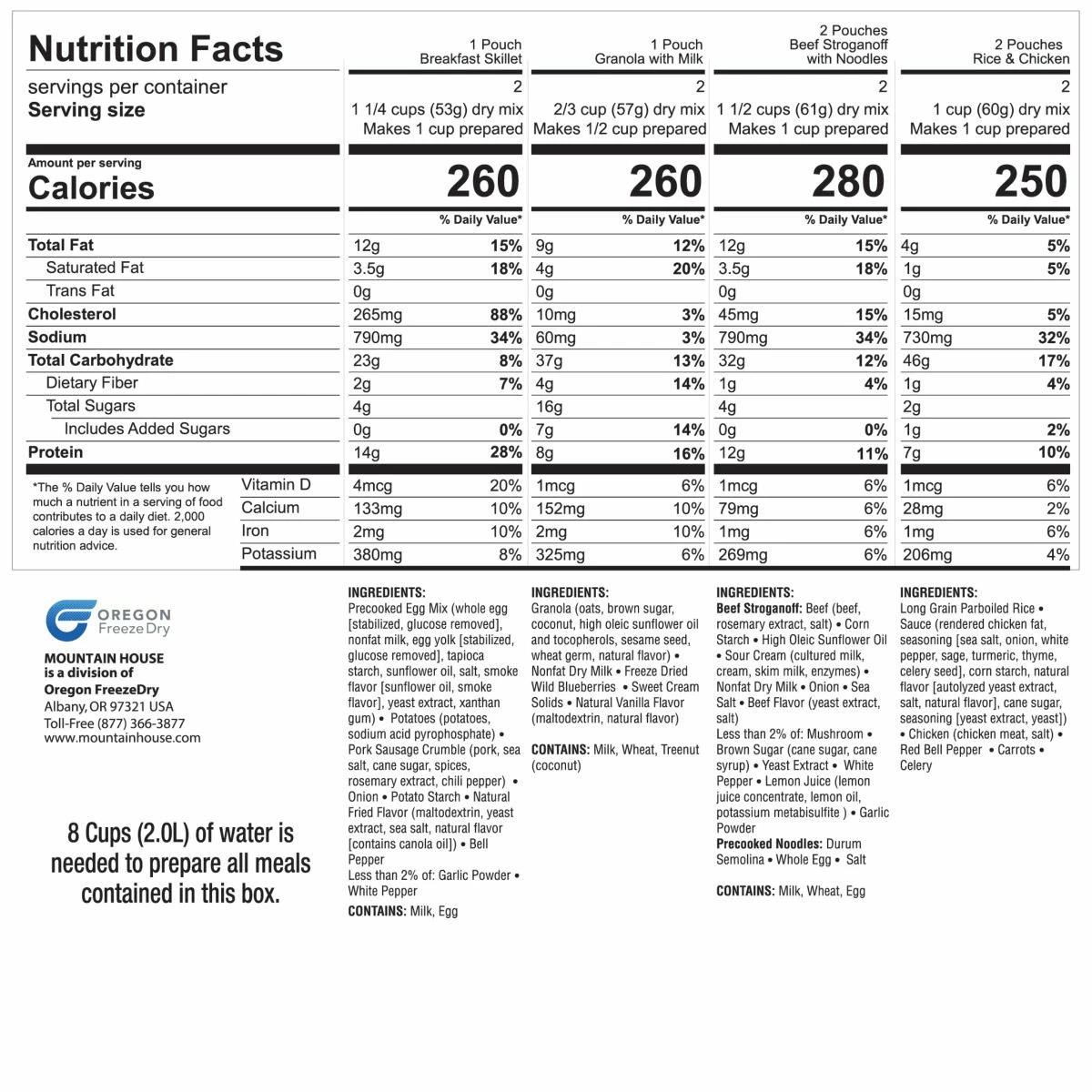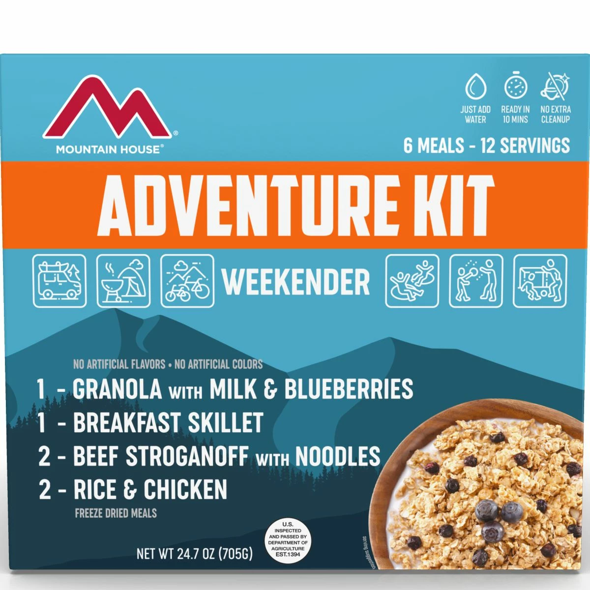 The Mountain House Adventure Weekender Kit contains breakfast, lunch, and dinner for one person for two days. Contains 6 total pouches (12 total servings) and makes planning for your next camping or backpacking trip simple.