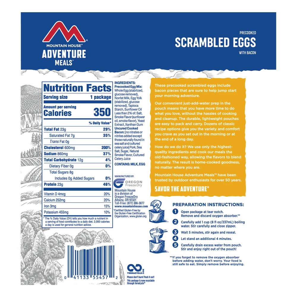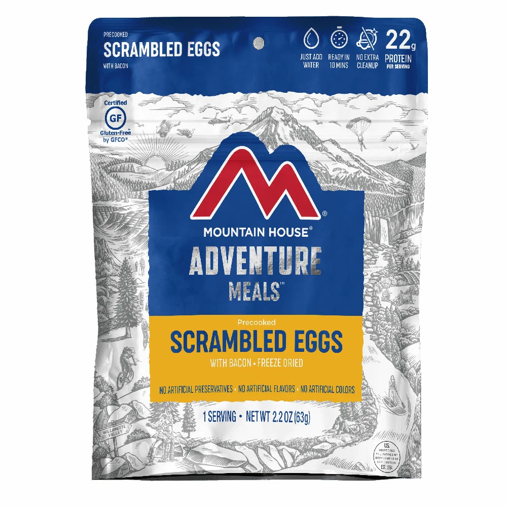 Mountain House Scrambled Eggs with Bacon: a high-protein, hearty breakfast classic that’s easy to prepare. No artificial flavors, preservatives, or colors.