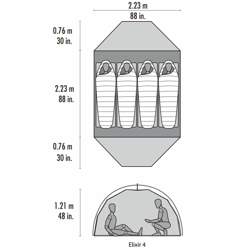 Featuring generous headroom and an optimized floor area that sleeps four comfortably, the MSR Elixir 4 person camping tent offers the livability you want for the whole group, whether you’re taking your friends backcountry camping or your family on a wilderness canoe trip. Two large StayDry™ doors provide easy access, while large vestibules let you store lots of gear. Breathable mesh fabric is balanced with solid canopy fabric to provide more privacy, and storm-ready, adjustable guy lines are pre-attached on the rainfly to offer extra stability when needed. This easy-to-assemble, freestanding 2 door tent comes with plenty of extras, including a footprint and built-in attic gear lofts.