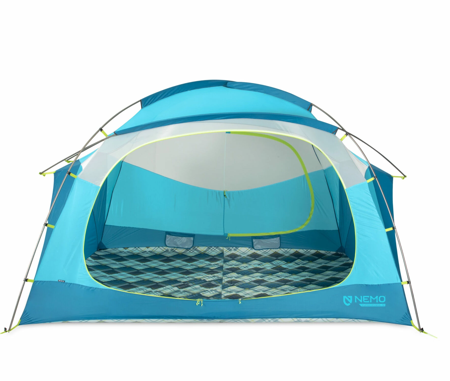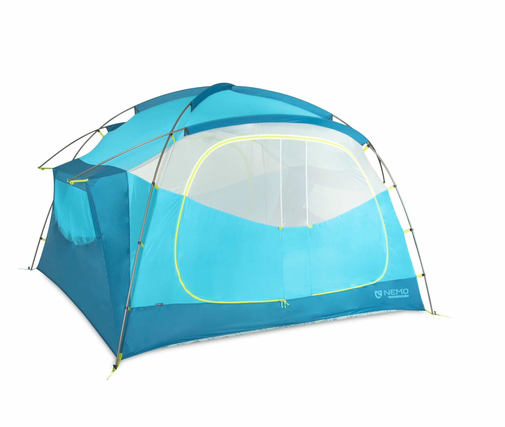 With a spacious standing-height design, simple setup, and vibrant colors, the NEMO Aurora Highrise 6P tent adds a dose of joy to every family camping adventure. Steep sidewalls provide massive interior volume, while large rain-protected windows add ventilation and great views. Two large doors and vestibules offer easy entry and plenty of room for keeping camping essentials organized and out of the weather.