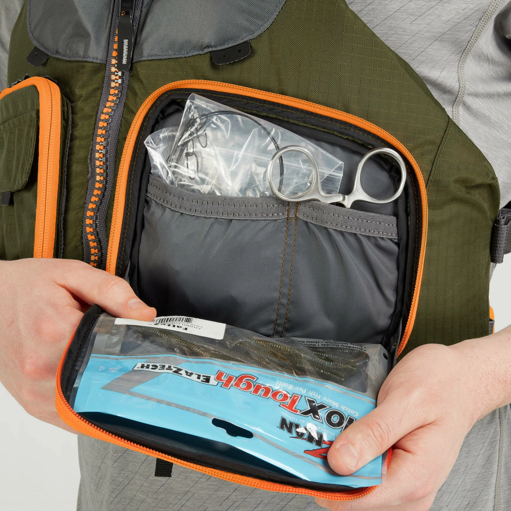 - A fifth, tool holder pocket offers quick access to pliers, line cutters or other fishing gadgets and secures with a hook-and-loop fastener.