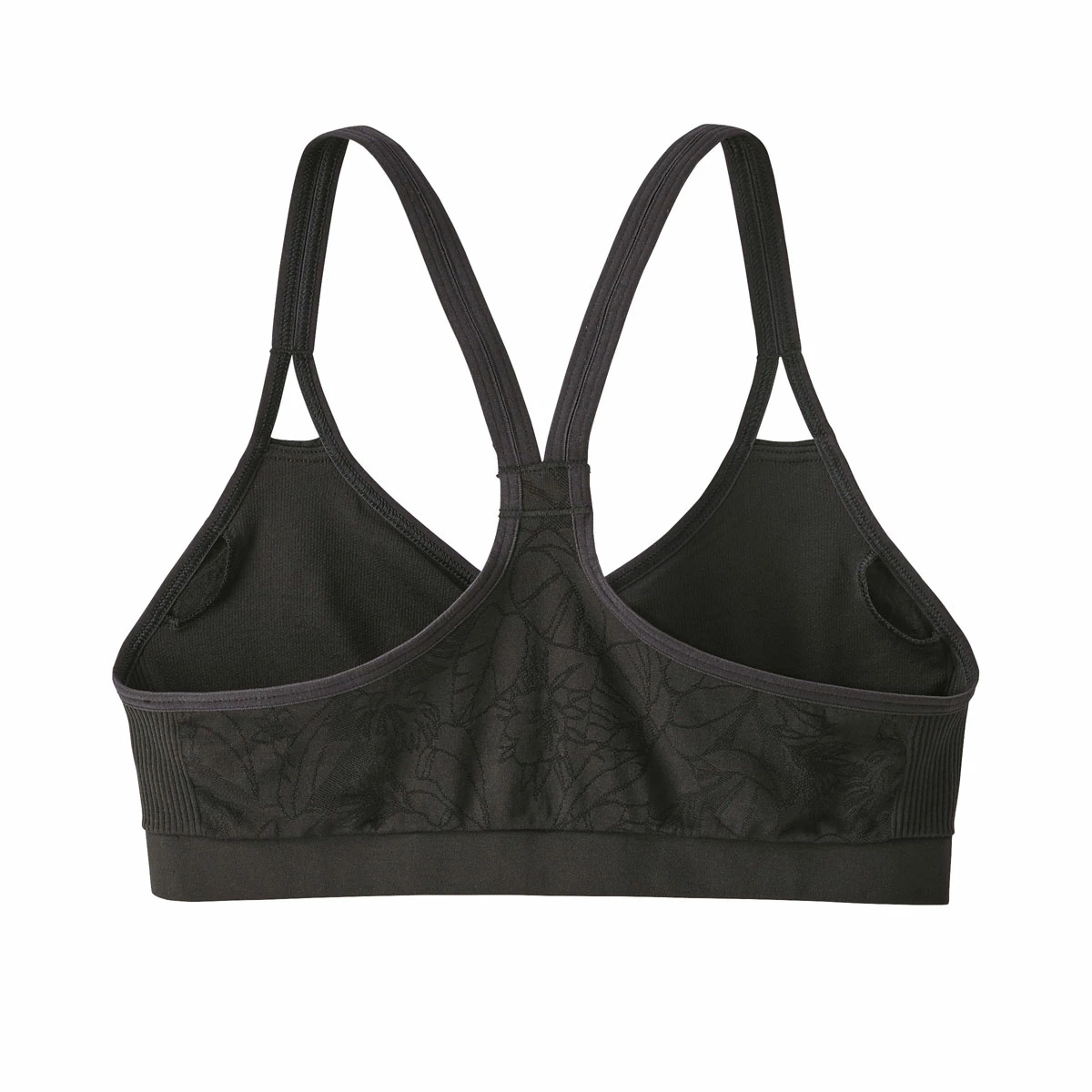 The Patagonia Barely Bra’s slender, nonslip straps won’t dig into your skin, and instead meet at a flattering racerback. An underbust panel offers support for B/C cups. Feminine details like the center gather for shaping and a double fabric front for modesty are nice extra touches. This medium support bra is made of a soft, featherweight, quick-drying nylon/spandex fabric blend with a contemporary geometric jacquard engineered into the fabric to wick moisture. Internal cup pocket allows for pads/inserts (cups included).