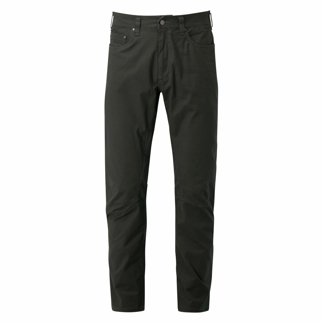 The Radius Pants from Rab are mid-weight stretch climbing pant, with slim leg, for year round climbing. They are constructed from a stretch cotton canvas fabric which has been combined with knee articulation and a crotch gusset allowing you a total freedom of movement. They have Jeans styling with a fixed waist, belt loops and button waist closure with a YKK fly. There are plenty of pockets, with two open hand – the right one featuring an internal smaller coin pocket, and two open patch pockets on the rear. To enhance the pants durability the hems are reinforced at the back of the heel areas.