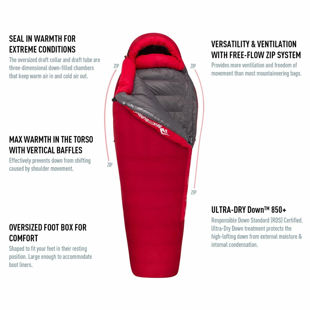 The Sea to Summit Alpine down mummy sleeping bag is designed for the rarefied world of high-altitude and arctic conditions. It features cutting-edge materials, the highest quality Ultra-Dry down, and complex construction. Expedition mummy sizing allows you to wear extra clothing and boot liners inside the bag.